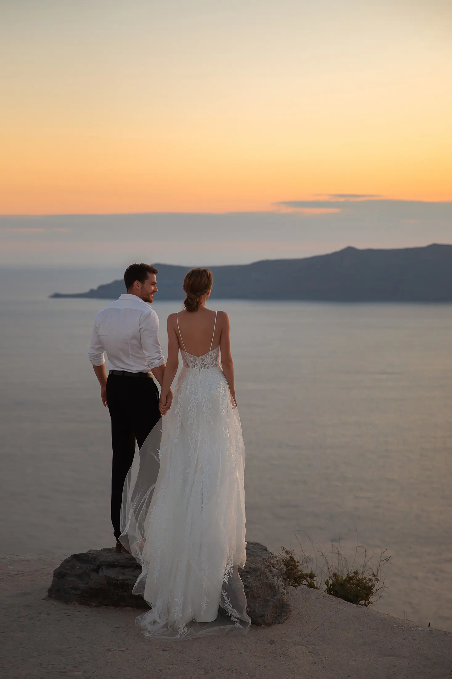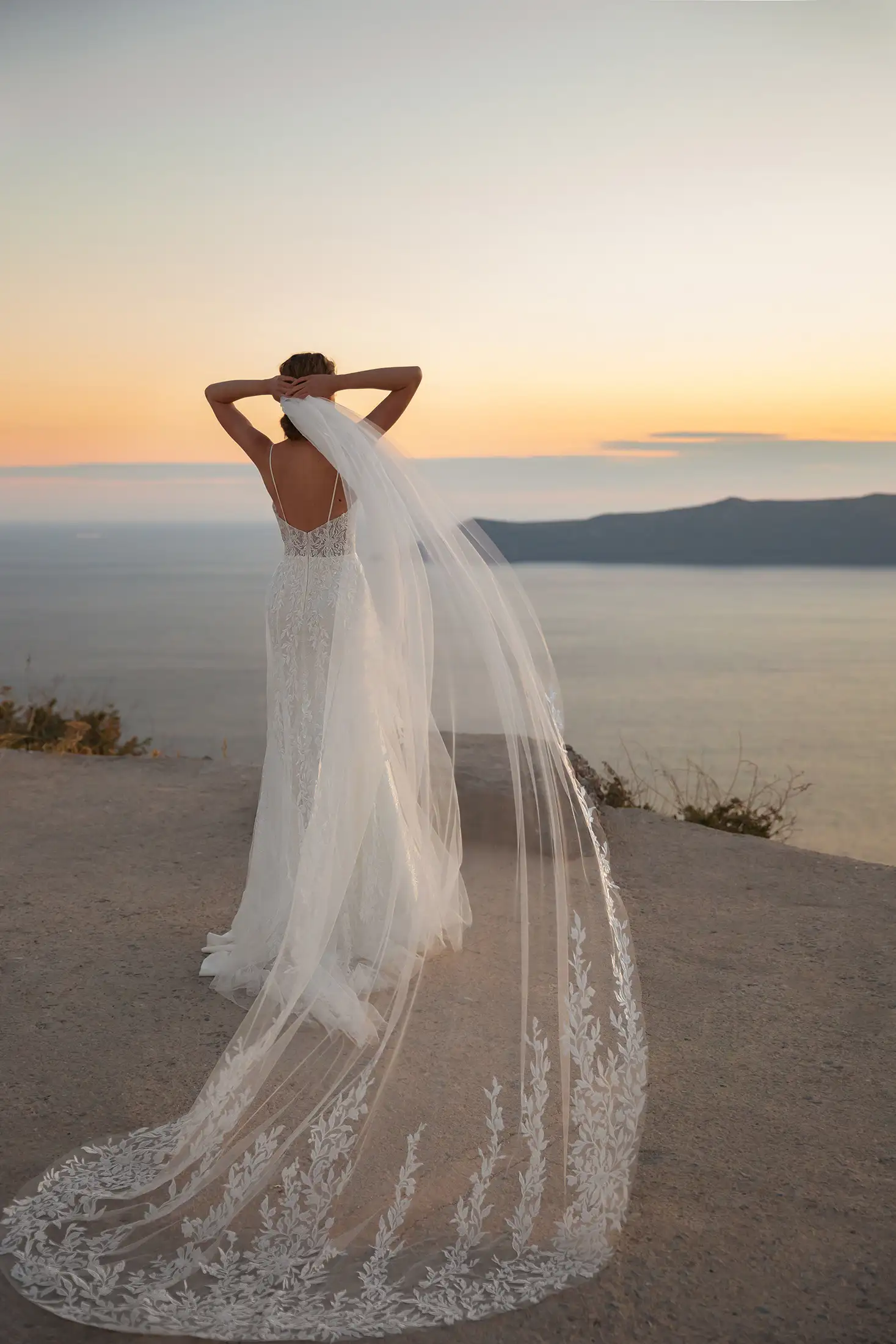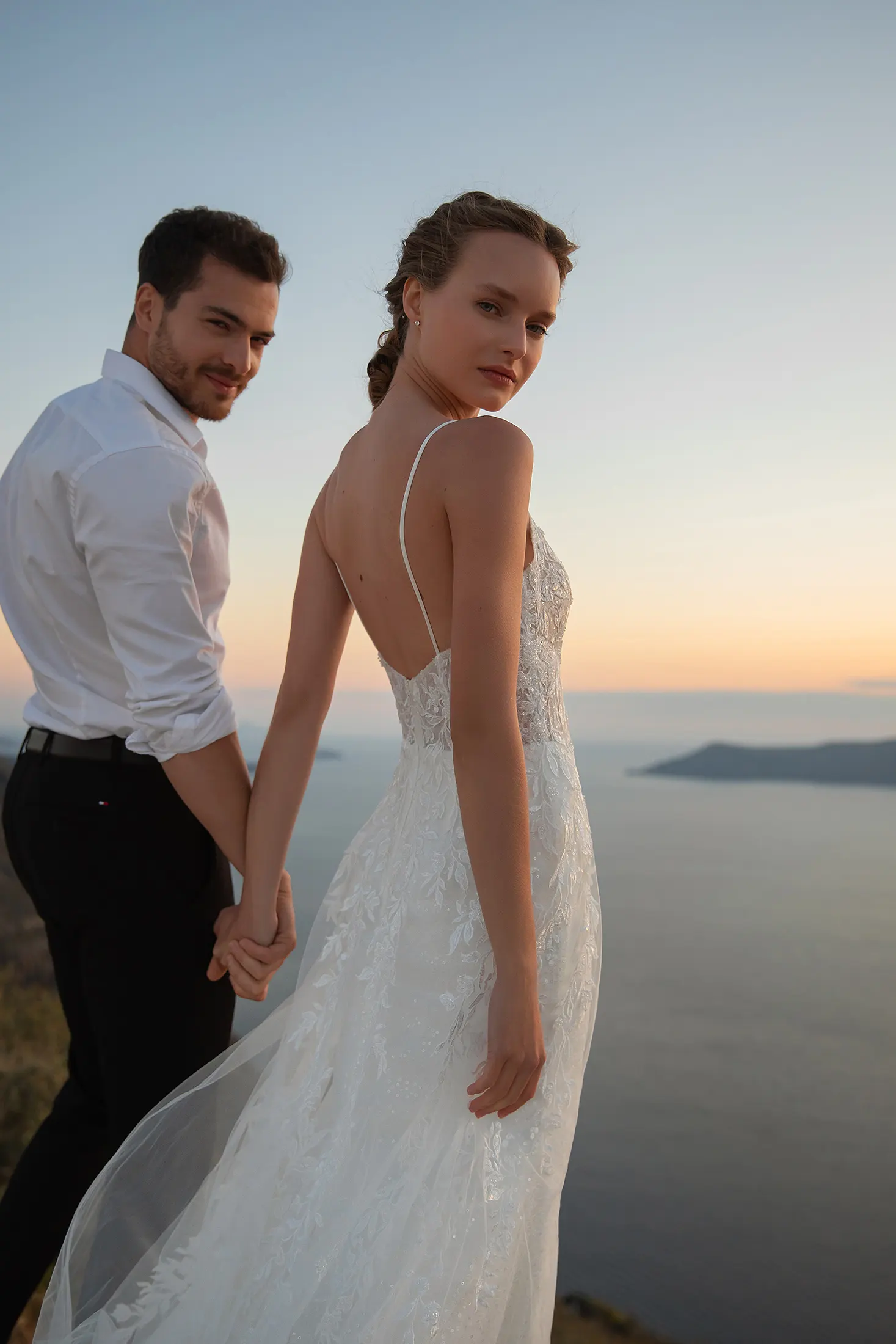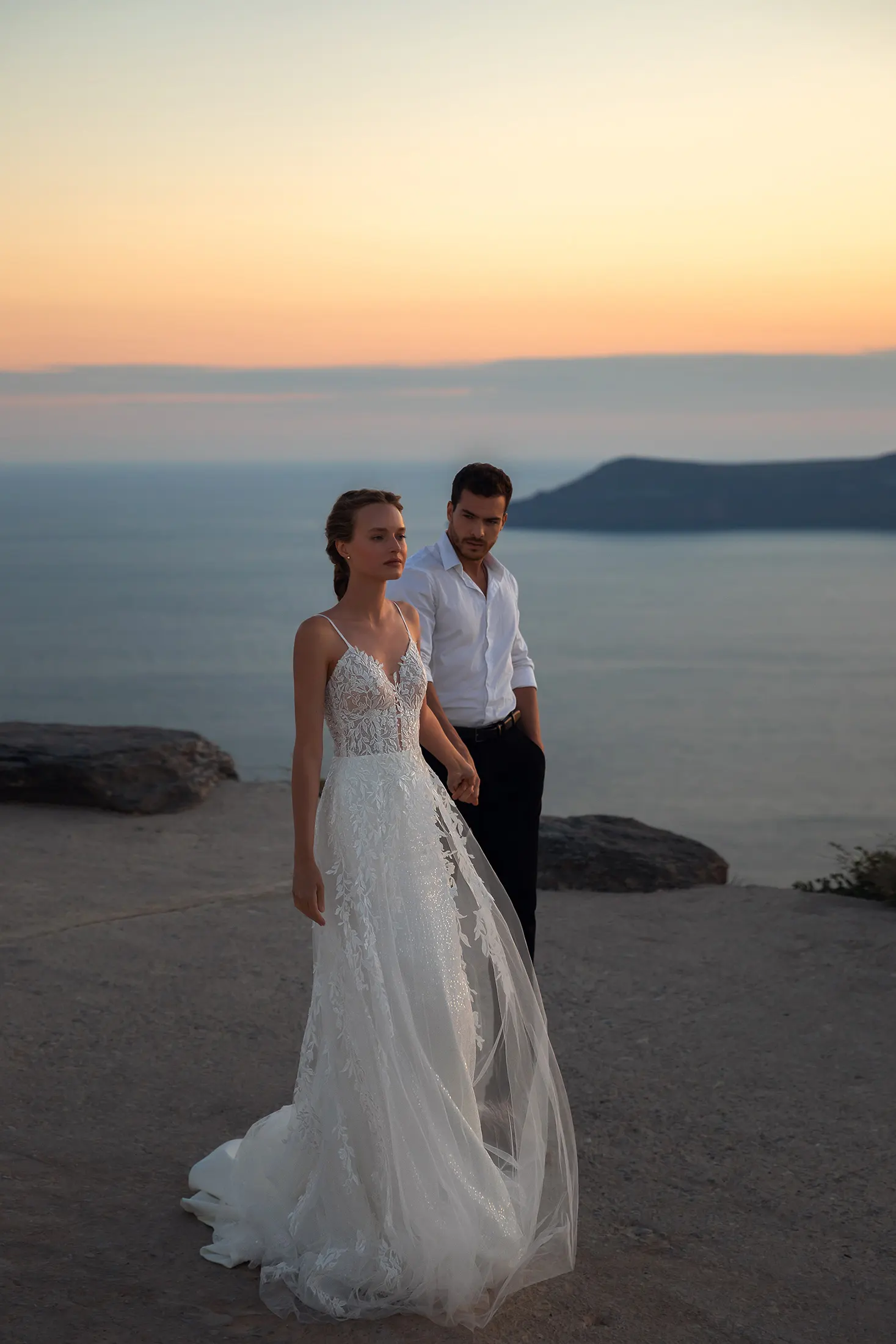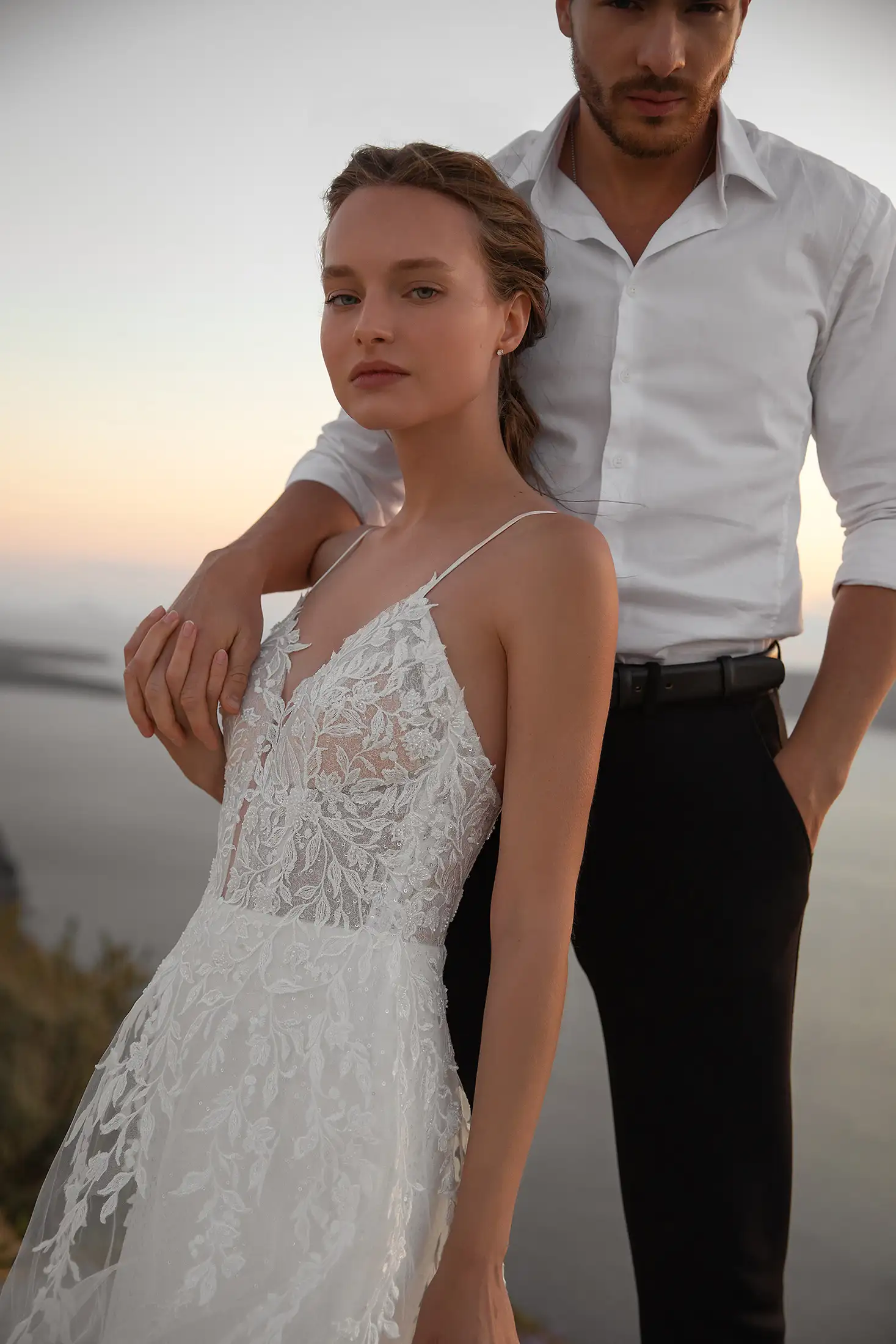 Este vestido de novia es una auténtica joya. Combina todo lo que las novias adoran: lujo, comodidad y sofisticación. Su falda ajustada de crepé y gasa, rematada con una capa de chantilly y una lentejuela transparente, se ciñe a la figura y realza la silueta. Los finos tirantes se deslizan desde el corpiño con un profundo escote en V hasta la espalda abierta. Lo más destacado del vestido es su encaje floral con cuentas. El adorno del corpiño, que cae en cascada sobre la capa de tul en forma de A, realza el look al máximo.